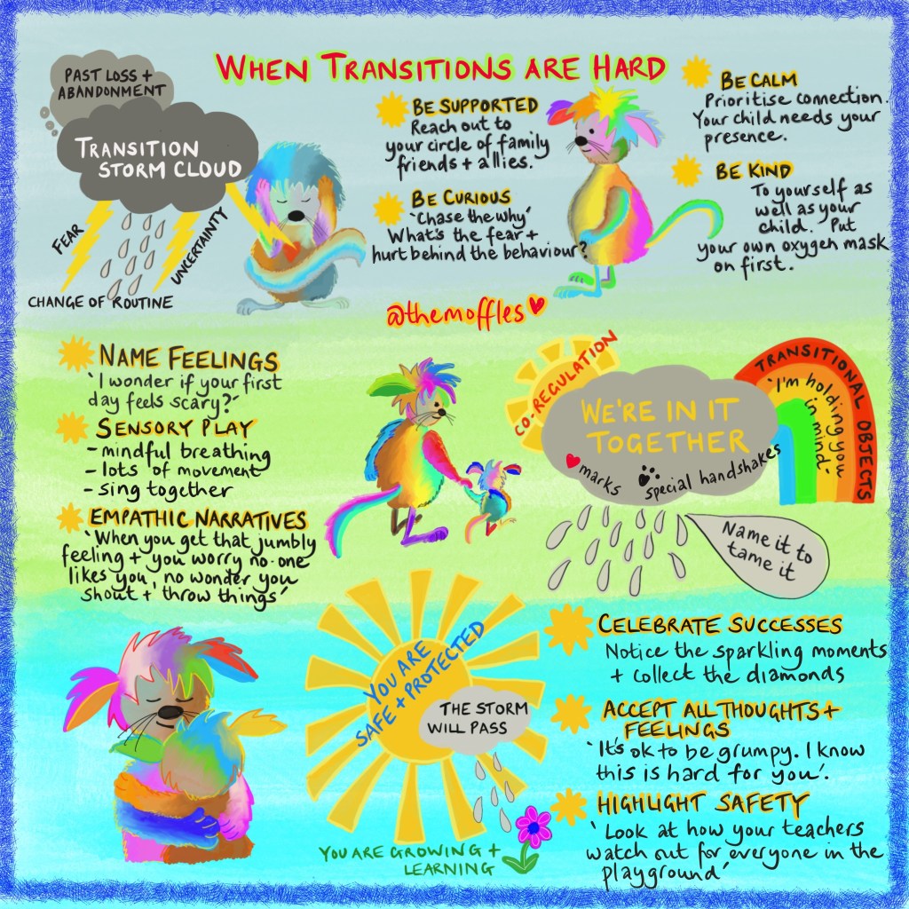 Parents, carers & teachers need to be prepared to weather the transition storms! Look after yourselves so that you have the resources to take care of & contain your little people. Self-care is a necessity, not a luxury & don’t be afraid to reach out to those around you who can help lighten the load.