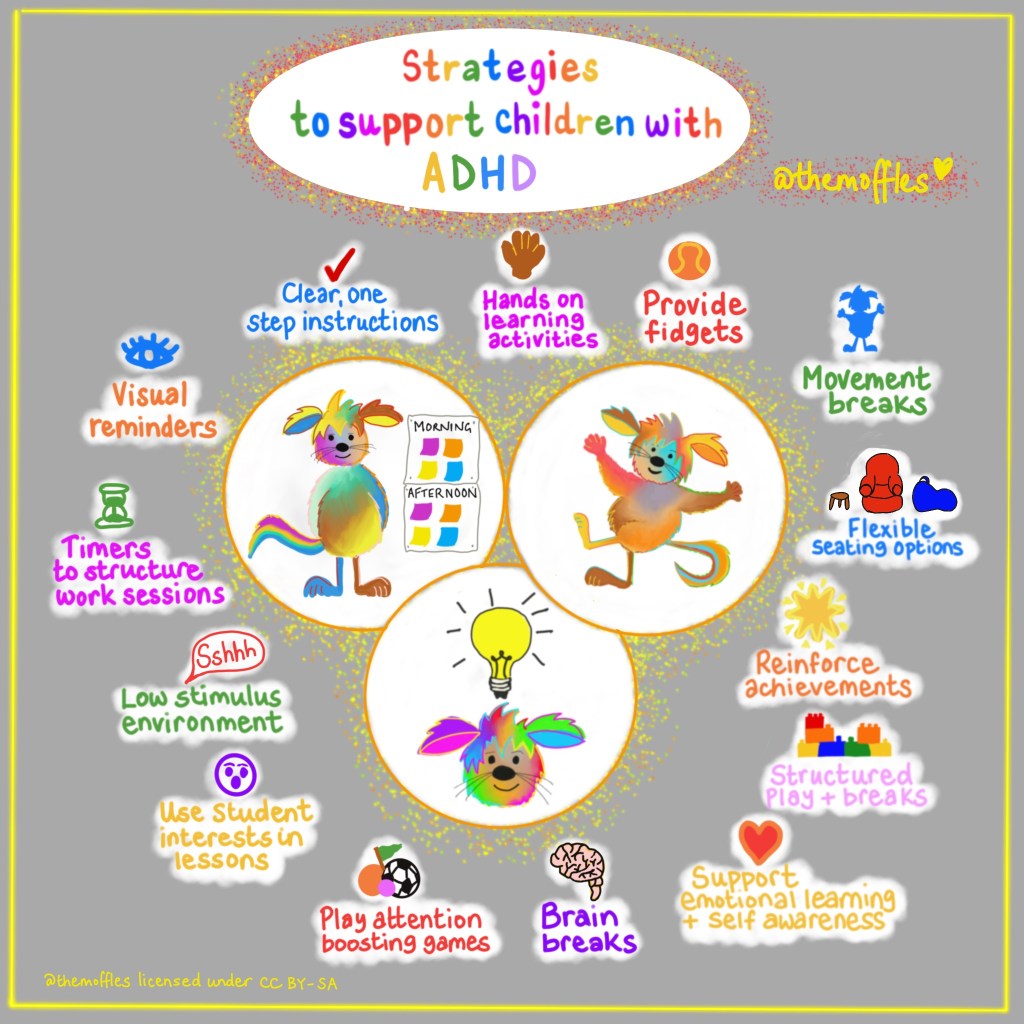 There is no ‘one size fits all’ to supporting children with ADHD in school, but there are a range of strategies that can help. This Moffle infographic highlights some suggestions. Good communication between home & school to develop a team approach & consistent intervention, is also very important.
