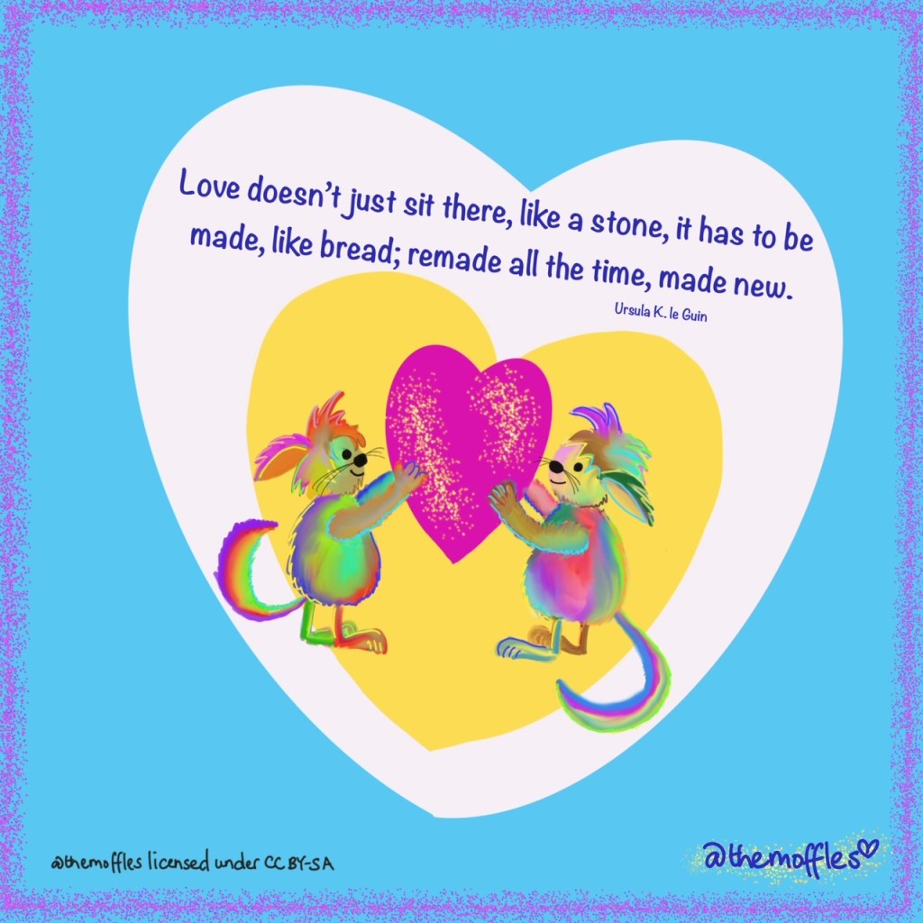 Creating love is a dynamic process – there is a hopefulness isn’t there, to the idea that it can be remade constantly, growing & changing over time. Just as re-parenting is an active commitment to developing trust & creating safety & connection. It is said that when you help a child to heal from trauma, you are participating in a rebirth. This is loving actively; providing food for the soul.