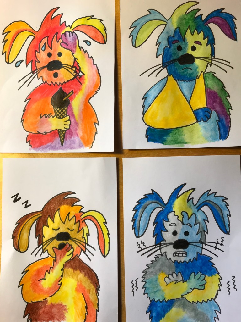 Here are some Moffle feelings cards for you & your child to cut out & colour. What colour are your feelings today? You can print off some small cards or the bigger pictures below.
