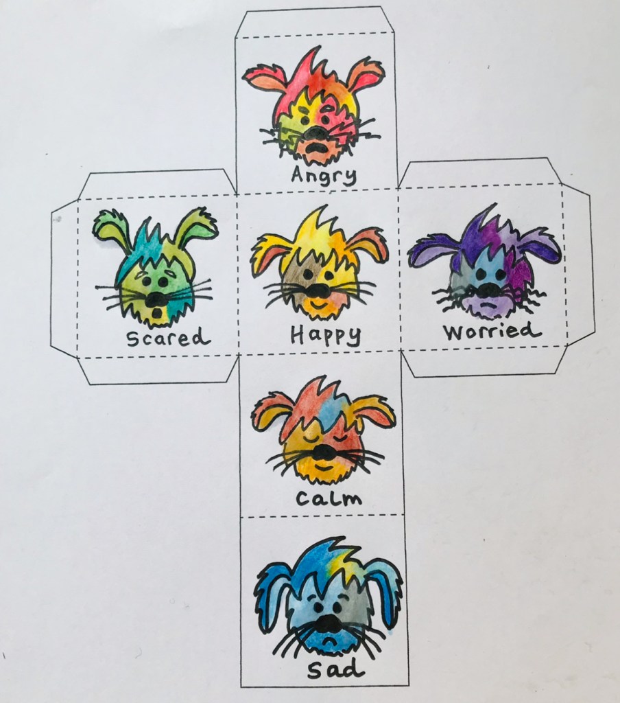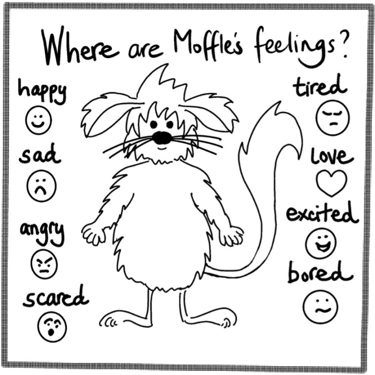 Here is a Moffle Feelings Cube for you to cut out and colour. You can roll it like a dice & talk about the feeling that lands on top. When have you felt this feeling? Don’t want to talk about it? Then roll it again!