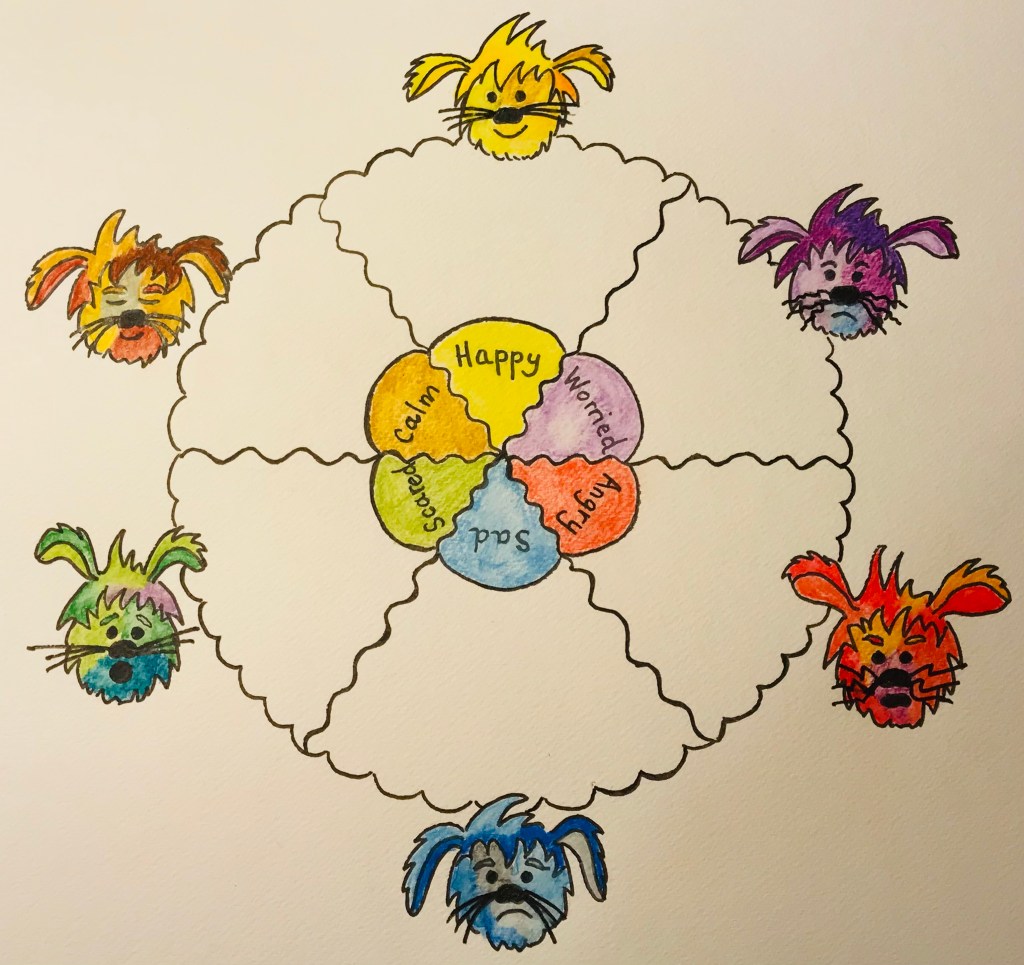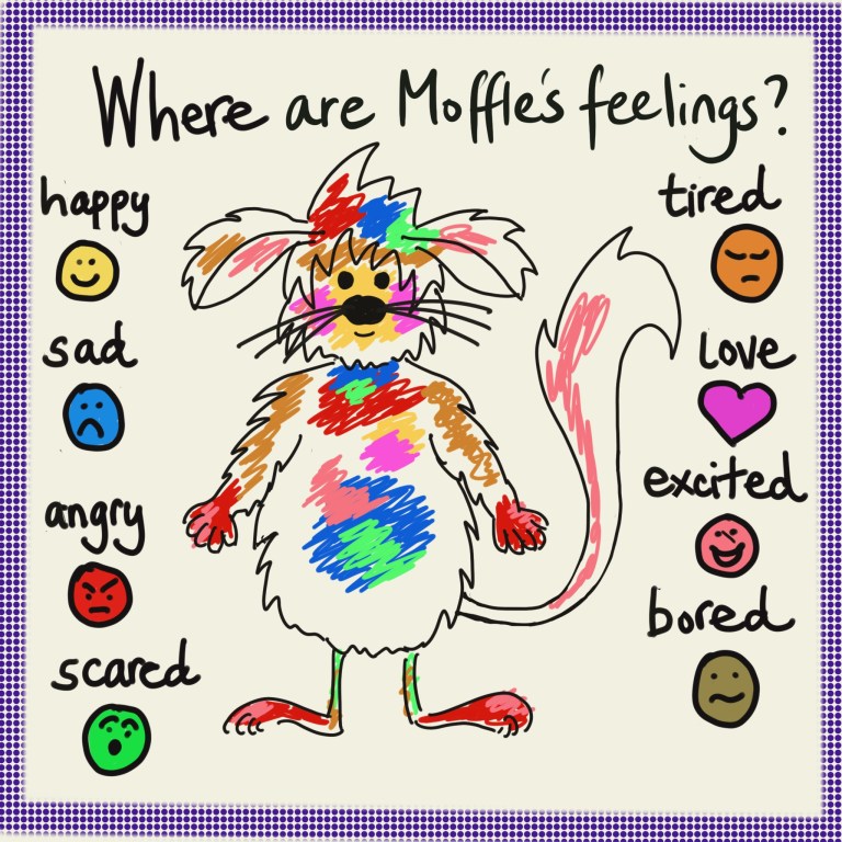 Using the Moffle outline rather than an outline of their own body, can help it feel more comfortable for some children to focus on emotions. It removes the spotlight from them onto the fluffy little characters, so it reduces the emotional demand & makes it feel safer.